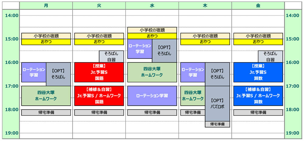 キミライトでは、四谷大塚NETのジュニア予習シリーズを主教材として算数と国語を週2日指導します。ジュニア予習シリーズは、長い指導経験をもとに四谷大塚が独自に開発した小学校低学年の「知能を育て、学力の基礎を身につける」ための教材で、興味・関心があることを自ら調べ、自ら考えることで、「学ぶ」ことの楽しさを知ります。「学ぶ」ことが楽しいと感じれば、どんな子どもでも「学ぶ」ことに自ら積極的に取り組み始めます。